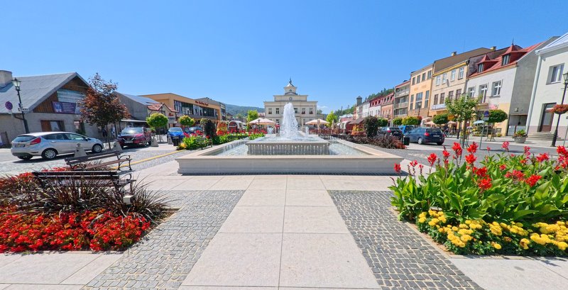 Rynek z kapliczkami św. Jana Nepomucena i św. Floriana oraz grany cztery razy dziennie hejnał.