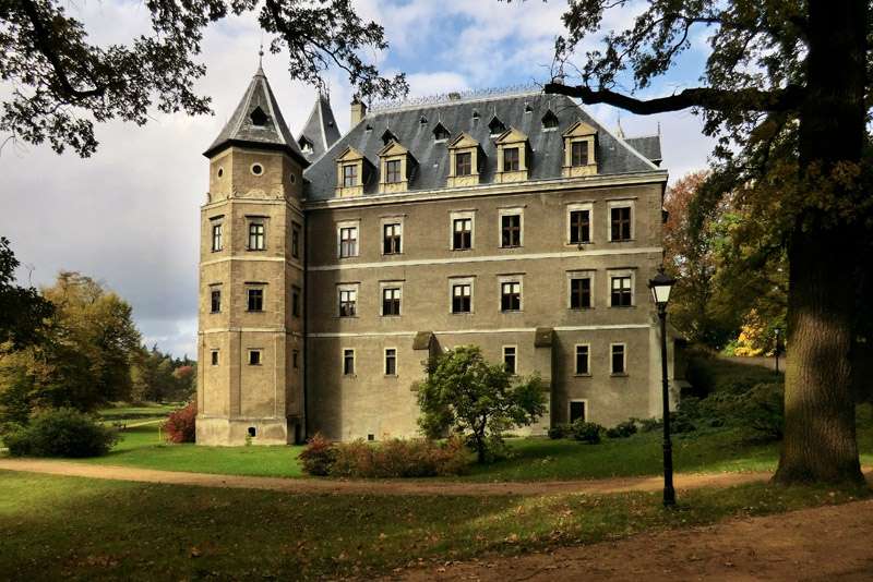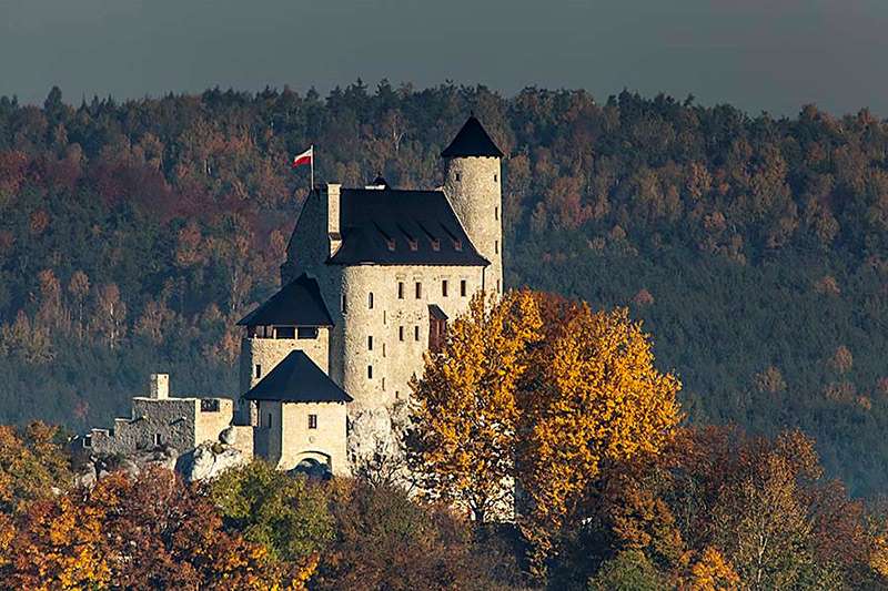 Zamek z białego wapienia malowniczo położony otoczony lasami jesienią przyozdobiony paletą barw