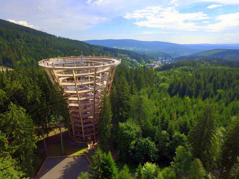 Wieża widokowa o nazwie Ścieżka w Koronach Drzew znajduje się na obrzeżach Jańskich Łaźni w Karkonoszach, około 30 kilometrów od polskiej granicy. Drewniana konstrukcja ma 45 metrów wysokości i na jej szczyt wiedzie ścieżka dydaktyczna o długości ponad 1500 metrów, na której znajdziemy tablice z informacjami o karkonoskiej faunie i florze. Ze szczytu roztacza się piękna panorama zalesionych gór. Dodatkową atrakcją jest zjeżdżalnia o długości 80 metrów, z której chętnie korzystają nie tylko najmłodsi – podobno do tej pory najstarszy amator zjazdu liczył 85 lat!