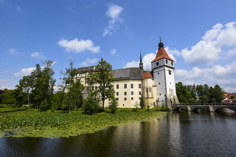 Wodny pałac Blatná należy do najlepiej zachowanych wodnych siedzib szlacheckich w Czechach. Pałac otacza piękny park angielski, który zamieszkuje stado danieli. Nad budowlą dominuje biała wieża, pięknie odbijająca się w tafli wody. Na gości czeka między innymi zwiedzanie salonu orientalnego, barokowego, w stylu empire, myśliwskiego oraz galerii rodowej właścicieli. Pałac został w 1990 roku zwrócony, w ramach restytucji, potomkom barona Karela Hildprandta.
