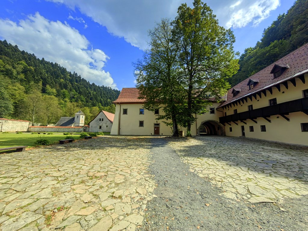 Na tym dziedzińcu całe stulecia panowała surowa klauzura - było to miejsce głębokiej wiary w Boga. Na obwodzie dziedzińca rozmieszczono mnisie domki - pustelnie (eremy) z przyległymi ogródkami. W zakonie kartuzów stosowano regułę: za klauzurą dwunastu pustelników i trzynasty przeor. Było tu więc trzynaście pustelni, połączonych wielkim krużgankiem. Istotną częścią wielkiego krużganka był cmentarz położony w pobliżu kościoła, żeby mnisi codziennie widzieli proste drewniane krzyże bez nazwisk. Według tradycji każdy mnich (kartuz) wykopywał w ogródku dół, który miał mu przypominać o śmierci. Treść legendy z pozdrowieniem "Memento mori" (Pamiętaj o śmierci) wynika z faktu, że mnich ma żyć tak, "Jakby codziennie był gotowy na śmierć".