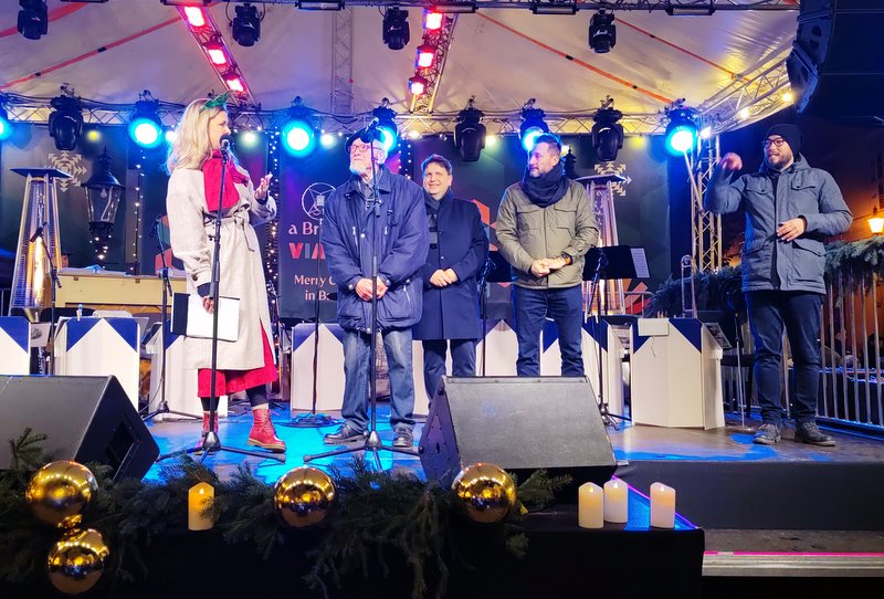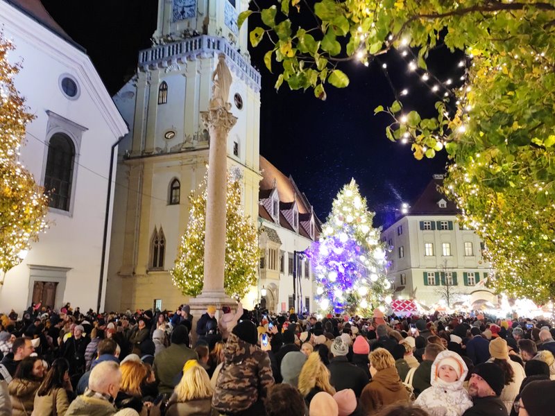 Burmistrz Bratysławy Matúš Vallo podczas oficjalnego otwarcia kiermaszu, i uroczystego zaświecenia największej choinki na rynku ( w środku w jasnej kurtce). Przy mikrofonie pan który podarował miastu tegoroczną choinkę, a którą kilkadziesiąt lat wcześniej posadził na swoim ogrodzie.