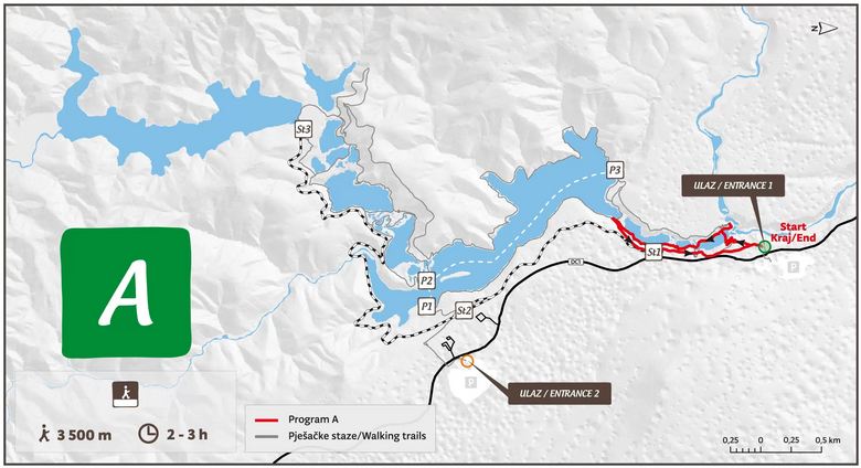Program rozpoczyna się przy wejściu południowym (Wejście 2) i obejmuje piesze zwiedzanie dużej części strefy jezior w Parku Narodowym Jezior Plitwickich. Wędrowcy zobaczą Wielki Wodospad, przejdą przez kanion Jezior Dolnych i wzdłuż zachodniego wybrzeża jeziora Kozjak, dalej do wodospadów Prštavci, największych i najpiękniejszych wodospadów Jezior Górnych, i odwiedzą niedawno otwarty punkt widokowy Tomićevo Pogledalo. W drodze powrotnej spacerowicze mogą podziwiać wspaniałe Jeziora Górne i spacerować wzdłuż wschodniego brzegu jeziora Kozjak, do którego można dotrzeć krótką przejażdżką łodzią elektryczną. Kontynuacja programu obejmuje spacer po wschodniej stronie kanionu Lower Lakes, aż do punktu początkowego przy wejściu 2.