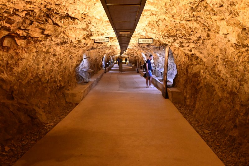 Na jednej ze ścian wisi archiwalna mapa miasta z zaznaczoną siecią tuneli – zaskakuje ich rozmach. System może pomieścić ponad 6000 osób, a jego korytarze ciągną się pod całym wzgórzem Kastel. W części pomieszczeń znajdują się ekspozycje – zdjęcia, przedmioty codziennego użytku z czasów wojennych, stare gazety, maski przeciwgazowe.