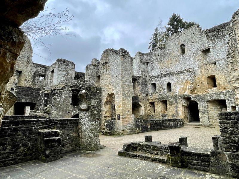 W roku 1170 tak przebudowano mury, że utworzono przejście po ich wewnętrznej stronie wokół trzech głównych zabudowań. Powstały wielkie łuki, na których wsparto mury o grubości aż 5 metrów. Dopiero w 1200r. zabudowuje się podzamcze, które też jest otoczone murem, a zamek rozrasta się tak, że zajmuje całe wzniesienie. Główny budynek rośnie w górę i ma 3 piętra. Wraz z budynkiem powiększa się kaplica; podczas ceremonii parter zajmują ludzie niższego stanu, a na piętrze może przebywać wyłącznie arystokracja. W roku 1250 zabudowaniom nadano styl gotycki, zmieniono układ podzamcza, a dostęp do zasadniczej części zamku wzmocniono dwoma kolejnymi bramami. Gdy śledzono historię zabudowy wzgórza to przełomem okazało się odkrycie miedziorytu datowanego na 1643r. gdyż wtedy powstało pierwsze graficzne przedstawienie zamku. Tragicznym dla zabudowań był rok 1820, kiedy to król Niderlandów podjął decyzję, że zamek będzie odsprzedany mieszkańcom okolicznych wiosek i będzie służył wyłącznie jako źródło pozyskiwania materiałów budowlanych. Niemniej jednak, przez kolejne lata był często odwiedzany przez turystów i podziwiany, jako „romantyczna ruina”. Rok 1977 to prawdziwy przełom, gdyż wszystko to co pozostało po zamku stało się własnością państwa Luksemburg i rozpoczęła się odbudowa. Dzięki temu dzisiaj możemy podziwiać zamek znów w całej jego okazałości z czasów jego największej świetności.