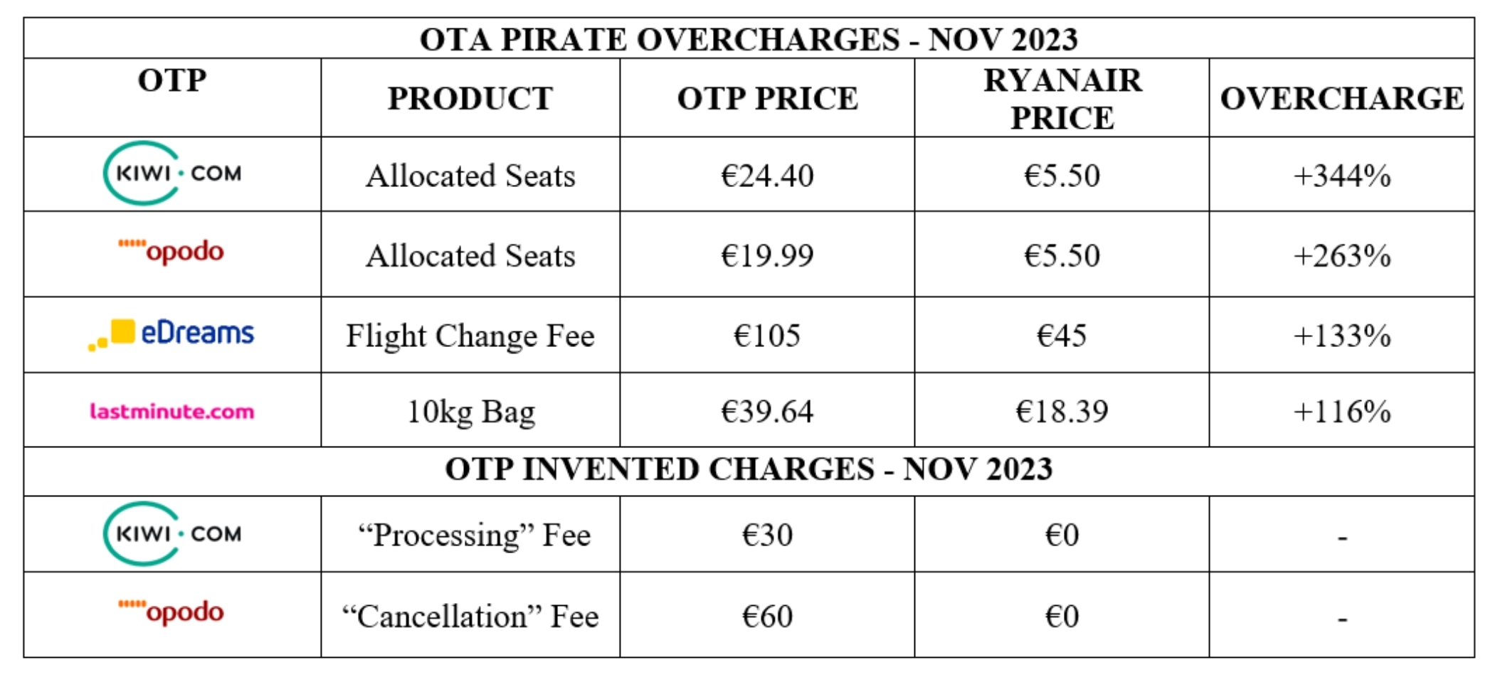 Ryanair w dalszym ciągu bada i zwraca uwagę na oszustwa konsumenckie popełniane przez piratów OTA, którzy podszywają się pod porównywarki cen, podczas gdy w rzeczywistości oszukują klientów wymyślonymi opłatami za „przetwarzanie” lub „anulowanie” lub pobierają zawyżone opłaty za usługi dodatkowe Ryanair aż do 344%!! Najbardziej rażącymi przykładami wymyślonej opłaty w niedawnej ankiecie był fakt, że Opodo.com pobiera od klientów 60 euro za „opłatę za odwołanie lotu”, gdy uzasadnione odwołanie lotu Ryanairem wiąże się z zerową opłatą, a Lastminut.com oszukuje swoich klientów naliczając 23 euro za przydzielone miejsce, które na Ryanair.com kosztuje zaledwie 5,50 euro. eDreams.com pobiera opłatę za zmianę lotu w wysokości do 60 euro oprócz opłaty za zmianę Ryanair, ale najbardziej rażącym nadmiernym obciążeniem ze wszystkich jest pobieranie przez Kiwi.com 24,40 euro za przydzielone miejsce, które na stronie Ryanair.com kosztuje zaledwie 5,50 €, co stanowi przedpłatę w wysokości 344%!!!