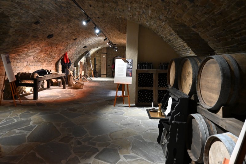 Prezentacja ekspozycji: W piwnicach zobaczymy rekonstrukcje narzędzi tortur i sceny historyczne przy manekinach, opatrzone tablicami informacyjnymi. Dodatkowo dostępna jest opcja zwiedzania w towarzystwie przewodnika, który opowiada także o lokalnych legendach, czarownicach i historii handlu winem.