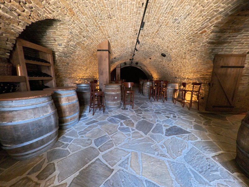 Skład wina: Zrekonstruowane piwnice ukazują dawną funkcję jako magazynu wina, z rampą do wtaczania beczek i elementami wystroju przypominającymi historyczne warunki.
