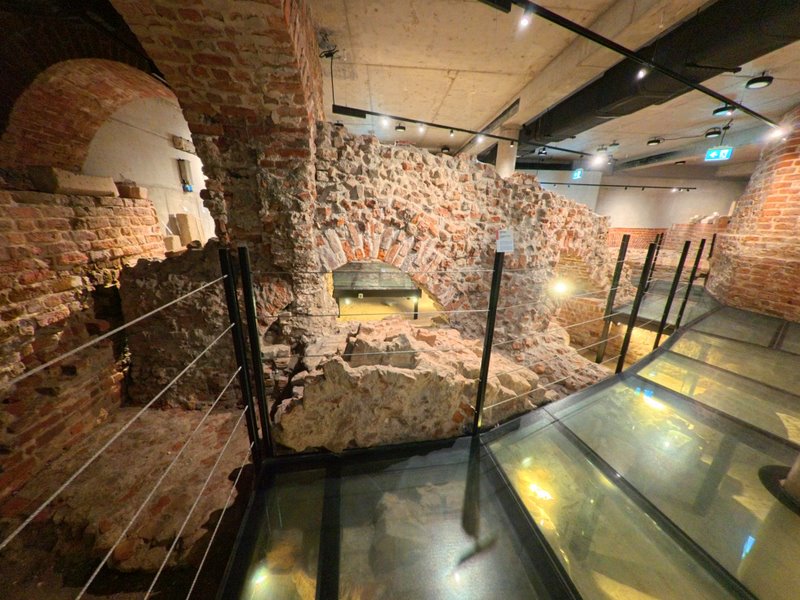 Przejście trasą prowadzącą do podziemi auli Henryka IV Probusa, gdzie interpretacja łączy architekturę i polityczną narrację Piastów.