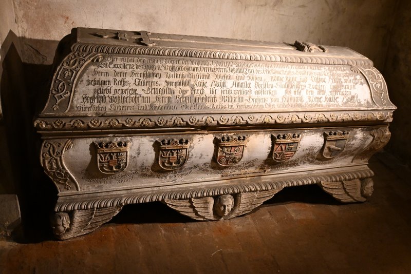 Naszym oczom ukazuje się przestrzeń krypt. Mrok rozprasza światło lamp, wydobywające z cienia sarkofagi. Ich zdobienia, wyryte dłutem kilkaset lat temu, zachowały się mimo wojen, pożarów i zawieruch dziejowych. Pomiędzy nimi – płyty nagrobne, niektóre wytarte niemal do nieczytelności. Najstarsza z nich pochodzi z 1461 roku. Każda to nie tylko kamień – to opowieść o człowieku, jego losach i roli w historii miasta.