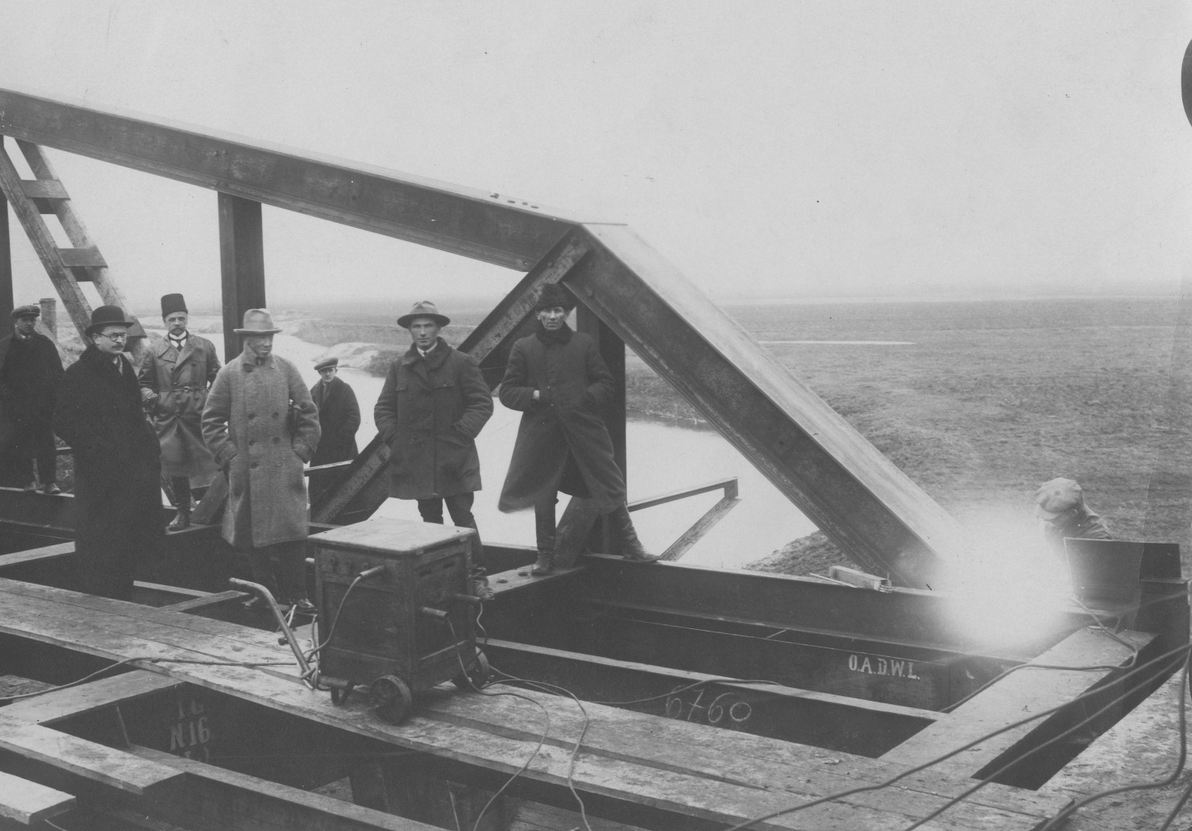 1929 , Drogowy most stalowy przez rzekę Słudwię w Maurzycach podczas budowy. foto wikipedia