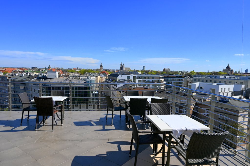 Nie musisz wspinać się na wieże kościołów – wystarczy wjechać na 6. piętro Hotelu Kossak i usiąść na tarasie Kawiarni Oranżeria. Przed Tobą: panorama Wawelu, zakole Wisły, dachy Starego Miasta, a przy dobrej pogodzie – Tatry i Babia Góra.