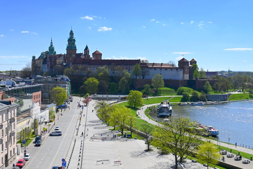 Z lewej strony nad dachami miasta wznoszą się gotyckie wieże Kościoła Mariackiego i sylwetka Ratusza. Na wprost – Wawel, dumnie górujący nad zakolem Wisły, zdaje się być na wyciągnięcie ręki. To miejsce, gdzie królewska przeszłość Krakowa dosłownie styka się z codziennością mieszkańców i turystów.