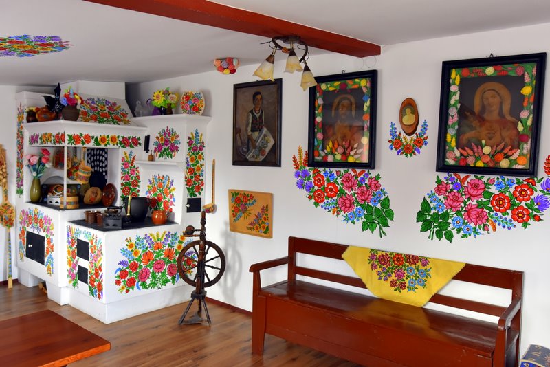 Daje się zauważyć, że kwiaty posiadają zazwyczaj obwódkę brązową, a liście czarną. Począwszy od roku 1948 cyklicznie odbywa się tutaj cieszący się dużym zainteresowaniem konkurs zatytułowany "Malowana chata". Jest on jednym z najdłużej rozgrywanych konkursów dotyczących sztuki ludowej w Polsce. Nagrody przyznawana są zasadniczo w dwóch kategoriach: malowidła nowe oraz zachowanie malowideł istniejących.