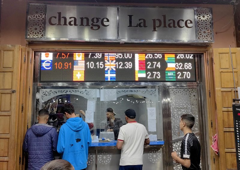 W Maroko walutą obowiązującą jest dirham marokański a w przeliczeniu to ok 0,4 zł. Płatności kartą tylko w dużych centach handlowych, hotelach, stacjach benzynowych i popularnych miejscach turystycznych (w większych miastach). Ogólnie należy mieć ze sobą gotówkę i najlepiej w mniejszych nominałach. Wypłaty z bankomatów zazwyczaj obciążone są prowizją (30-35 dirhamów). Nie ma problemu z wymianą euro na dirhamy w kantorach. Na zdjęciu poniżej kantor w centrum Marrakeszu na placu Dżami al-Fana (kurs z marca 2023). Kantory wymiany walut znajdują się także na każdej większej ulicy oraz w większych hotelach. Sumując: można płacić kartą w w części miejsc, ale na wyjazd warto zabrać euro i wymienić na miejscu w kantorze.