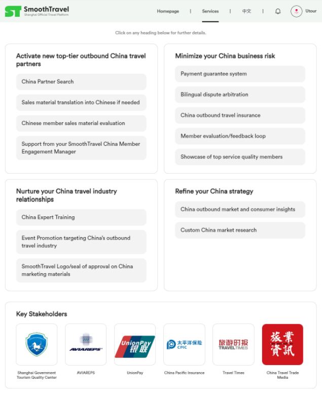 SmoothTravel ma na celu skutecznie połączyć międzynarodowe firmy turystyczne z rozwijającym się chińskim rynkiem turystycznym. Zapewniając wsparcie dla różnych sektorów, w tym m.in. destynacji, touroperatorów, grup hotelowych, DMC, wypożyczalni samochodów i wielu innych, platforma umożliwia poszerzenie możliwości biznesowych na chińskim rynku.
