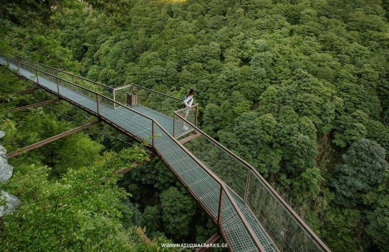 Jeśli kiedykolwiek marzyłeś o przechadzce zawieszonej w powietrzu – Okatse Canyon spełni Twoje oczekiwania z nawiązką. Kładka o długości 780 metrów prowadzi wzdłuż stromych skał, a miejscami... nad niczym innym, jak przepaścią głęboką na 100 metrów.