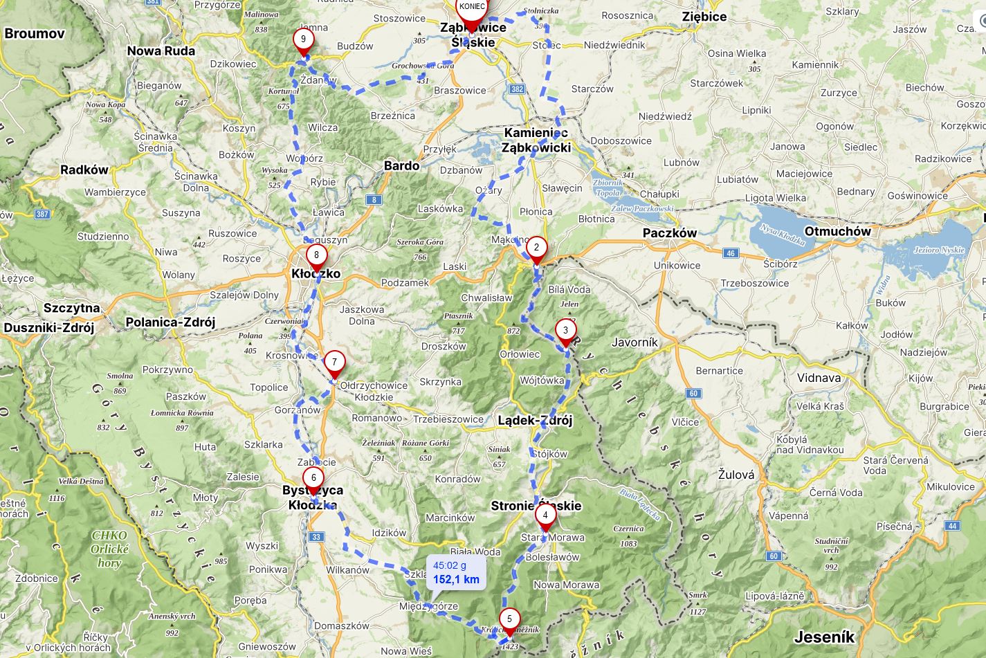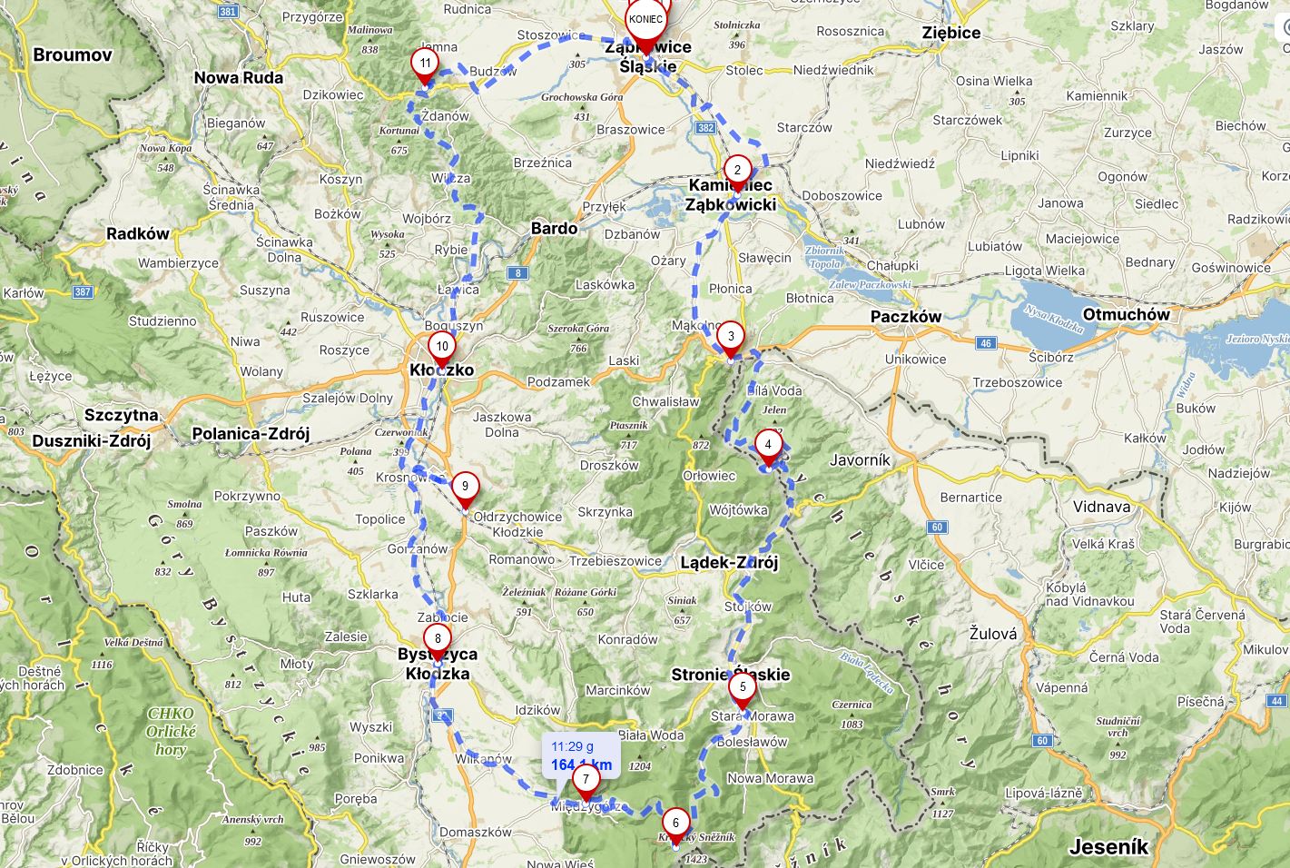 Cały szlak rowerowy (bez odbić i bez wjazdu na Śnieżnik): ok. 164 km; podjazdów 1 959 m, zjazdów 1 969 m