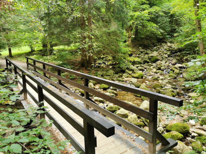 Za Karpaczem szlak wiedzie przez doliny Karkonoszy, najwyższego pasma Sudetów, objętego ochroną w ramach Karkonoskiego Parku Narodowego. To kraina wodospadów, torfowisk i rozległych panoram, gdzie przyroda wciąż zachowała swój dziki charakter. Na szlaku często towarzyszy tylko szum wiatru i zapach świerków. Często spoglądam na grzbiet pasma górskiego ze Śnieżką w roli głównej, po którym wiedzie Główny Szlak Sudecki. Tam, zarówno na szlaku jak i w wielu schroniskach może być spory ruch i gwar, którego nie mam na szlaku jakim podążam. Mam za to zapach lasu, śpiew ptaków i szum wody, a to najlepsza muzyka dla tych, którzy szukają autentycznego odpoczynku.
