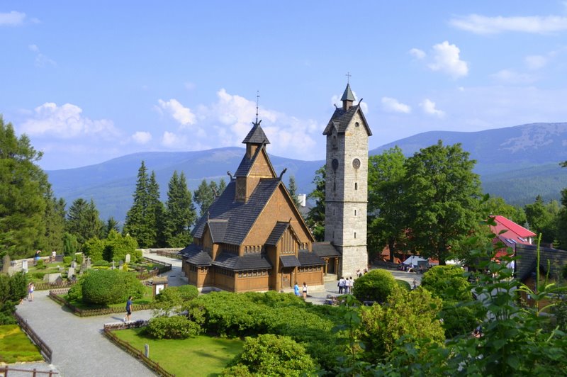 W drugim dniu marszu docieram do Karpacza, gdzie wznosi się słynny Kościół Wang. Ten niezwykły drewniany obiekt został w XIX wieku przeniesiony z Norwegii, z miejscowości Vang, i ponownie zmontowany u stóp Śnieżki. Jego drewniana konstrukcja, zdobiona motywami nordyckimi, stała się symbolem spotkania kultur i świadectwem europejskiej wymiany artystycznej sprzed dwóch stuleci.