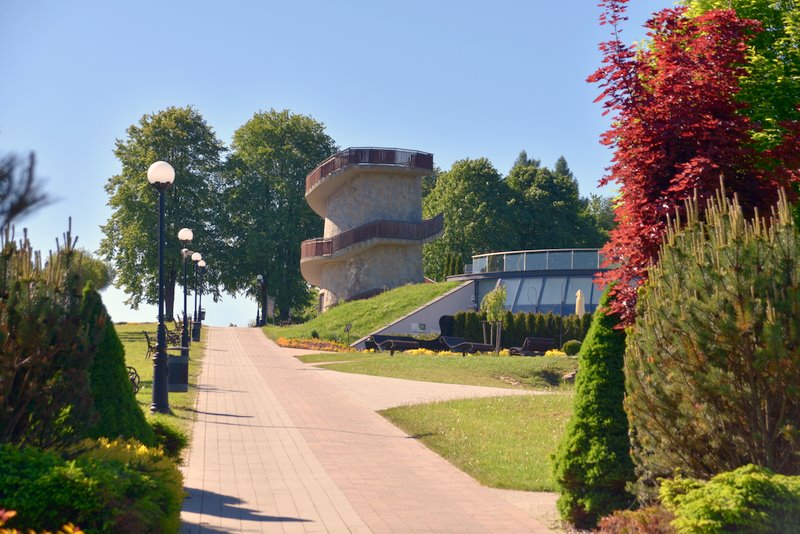 Na najwyższym wzgórzu — wieża widokowa, z której roztacza się panorama okolicy wraz z widokiem na Tatry.