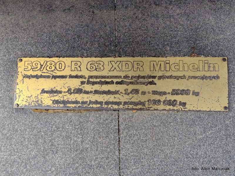 Oznaczona symbolem 59/80 R 63 MICHELIN XDR to największa opona świata, przeznaczona do pojazdów górniczych pracujących w kopalniach odkrywkowych. Średnica - 4,03 m, szerokość - 1,48 m, waga - 5000 kg. Zbrojenie wewnętrzne to aż 890 kilogramów stali. Obciążenie na jedną oponę powyżej 100 000 kg. Mimo że opona stoi przed zakładem w formie pomnika to nie jest wyłącznie ozdobą firmy. Takie opony są produkowane w Olsztyńskiej fabryce. Jaki może być koszt takiego kolosa ? Niestety nie są to ceny katalogowe a takie zamówienia negocjowane są indywidualnie. Mniejsza, bo zaledwie 57-calowa i starsza siostra XKD1, kosztuje około 350 tys. zł. Biorąc pod uwagę że np taki BiełAZ 75710 ma założone 6 sztuk, to za same opony tej ciężarówki trzeba zapłacić sporo ponad 2 mln zł. Zresztą za takiego giganta trzeba też słono zapłacić, bo chcąc zamówić wywrotkę ze standardowym wyposażeniem to jej cena może przekroczyć granicę 5 milionów dolarów.
