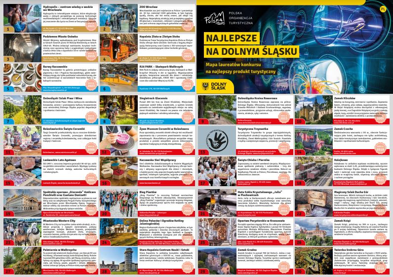 Prezentujemy również najnowszy, drukowany materiał promocyjny ukazujący dotychczasowych laureatów z Dolnego Śląska. Nasz region jest wyjątkowo bogaty w nagrodzone atrakcje. W całej historii konkursu do naszego województwa trafiło 20 certyfikatów ogólnopolskich – tyle samo mają tylko województwa małopolskie i śląskie. Laureaci etapu regionalnego natomiast mogą liczyć na wsparcie promocyjne od Dolnośląskiej Organizacji Turystycznej i Samorządu Województwa, są też automatycznie kierowani do krajowego etapu konkursu.