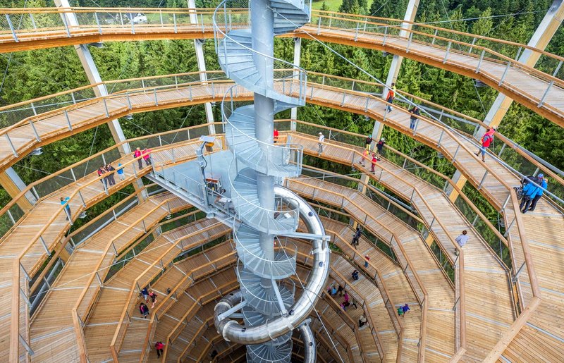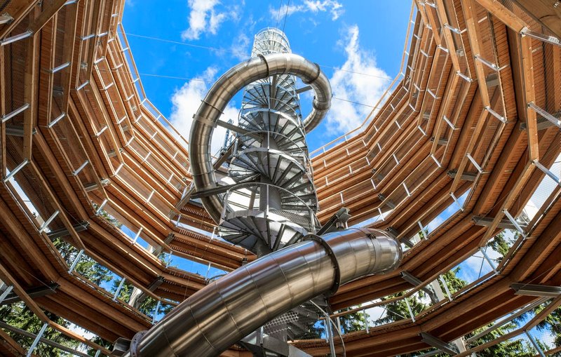 We wnętrzu wieży widokowej znajduje się ponad 80-metrowa zjeżdżalnia, dzięki której możesz sobie skrócić drogę w dół i jednocześnie poczuć istny zastrzyk adrenaliny.