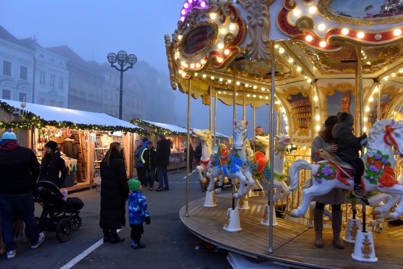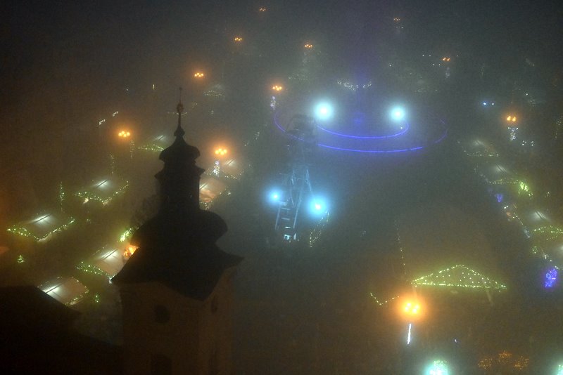 Wiele osób pokonuje ponad 200 schodów by wejść na wysoką Białą Wieżę górującą nad rynkiem. Także i ja wszedłem tam dwukrotnie, by w dzień oraz po zachodzie słońca spojrzeć na jarmark i panoramę miasta. Niestety, gęsta mgła choć dodała tajemniczości, nie odsłoniła w pełni kolorowego jarmarku, dużej choinki, wielkiego koła widokowego, karuzeli, lodowiska, sceny czy dziesiątek kramów otoczonych gwarnym uśmiechniętym tłumem.