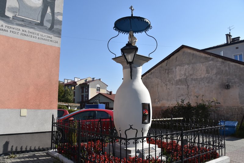 Kapliczka przy ul. Węgierskiej z rzeźbą Jezusa Frasobliwego z 1593 – miejsce, w którym zapalono pierwszą na świecie uliczną lampę naftową
