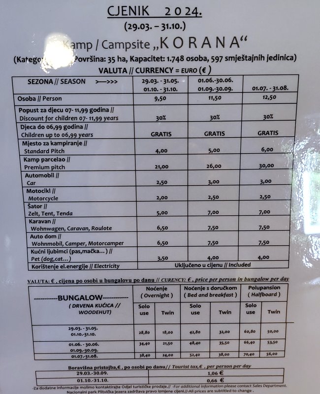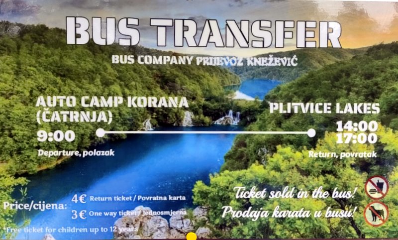 Z kempingu do Jezior Plitwickich kursuje specjalny autobus. W stronę jezior wyrusza o 9.00 a powrót o 14.00 oraz o 17.00. Bilet w jedną stronę to koszt 3 euro a w obie strony to 4 euro.