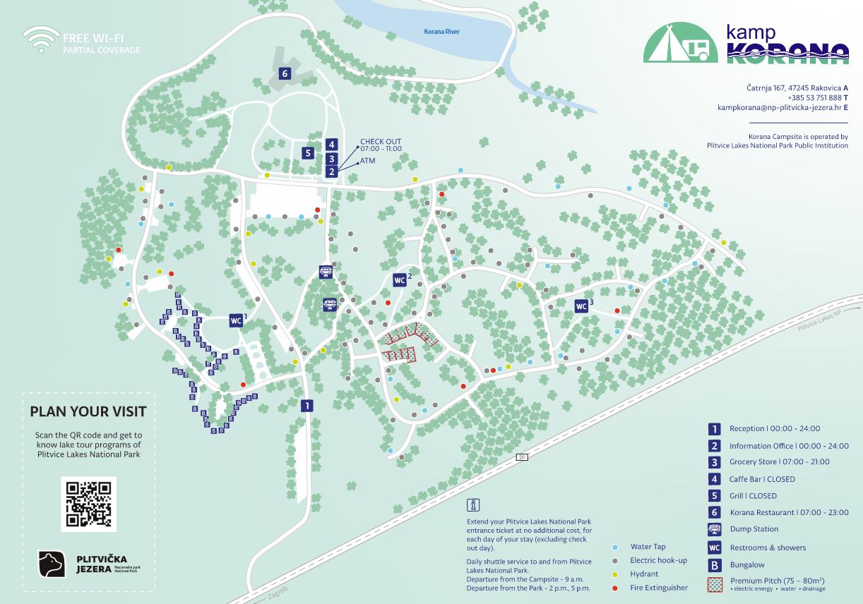 Przyjemne otoczenie kempingu jest zalesione i pięknie zagospodarowane, co wraz z bujnymi lasami i rzeką Korana w bezpośrednim sąsiedztwie czyni ten obszar atrakcyjnym miejscem dla osób poszukujących aktywnego wypoczynku. Bungalowy usytuowane są w osobnej strefie nie kolidującej z parkującymi kamperami.
