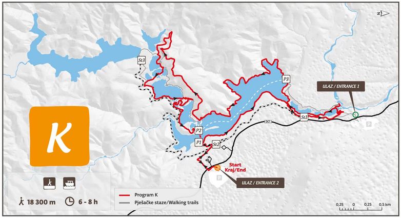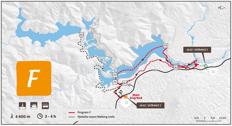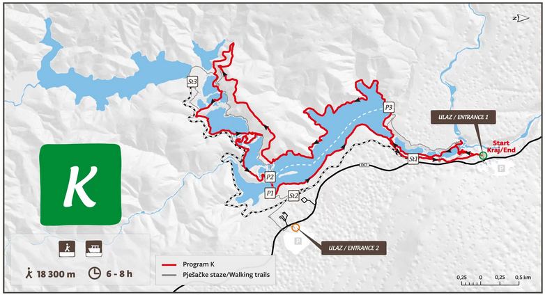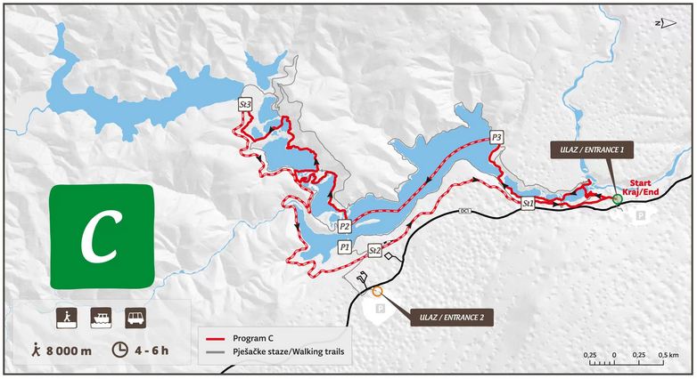 Program rozpoczyna się przy wejściu północnym (Wejście 1) i obejmuje piesze zwiedzanie dużej części strefy jeziornej w Parku Narodowym Jezior Plitwickich. Wędrowcy zobaczą Wielki Wodospad, przejdą przez kanion Jezior Dolnych i wzdłuż zachodniego wybrzeża jeziora Kozjak, dalej do wodospadów Prštavci, największych i najpiękniejszych wodospadów Jezior Górnych, i odwiedzą niedawno otwarty punkt widokowy Tomićevo Pogledalo. W drodze powrotnej spacerowicze mogą podziwiać wspaniałe Jeziora Górne i spacerować wzdłuż wschodniego brzegu jeziora Kozjak, do którego można dotrzeć krótką przejażdżką łodzią elektryczną. Kontynuacja programu obejmuje spacer po wschodniej stronie kanionu Lower Lakes, aż do punktu początkowego przy wejściu 1.