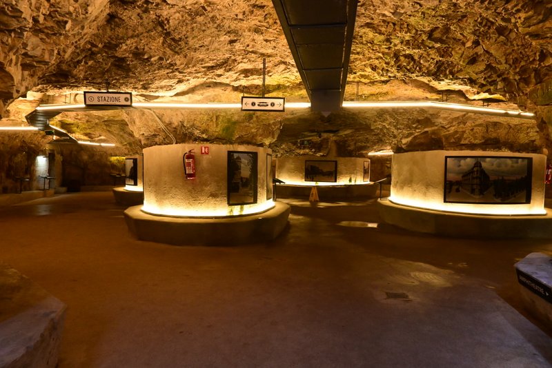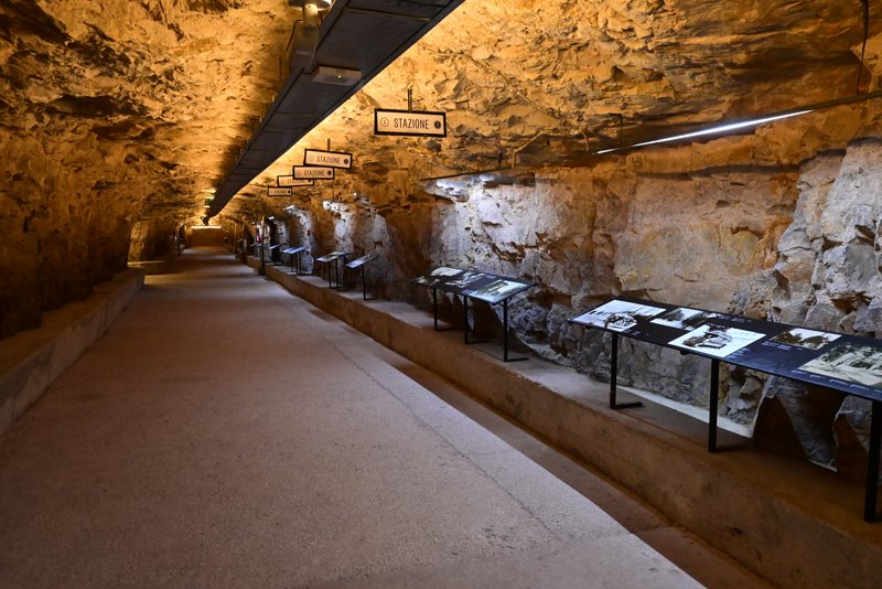 Na jednej ze ścian wisi archiwalna mapa miasta z zaznaczoną siecią tuneli – zaskakuje ich rozmach. System może pomieścić ponad 6000 osób, a jego korytarze ciągną się pod całym wzgórzem Kastel. W części pomieszczeń znajdują się ekspozycje – zdjęcia, przedmioty codziennego użytku z czasów wojennych, stare gazety, maski przeciwgazowe.