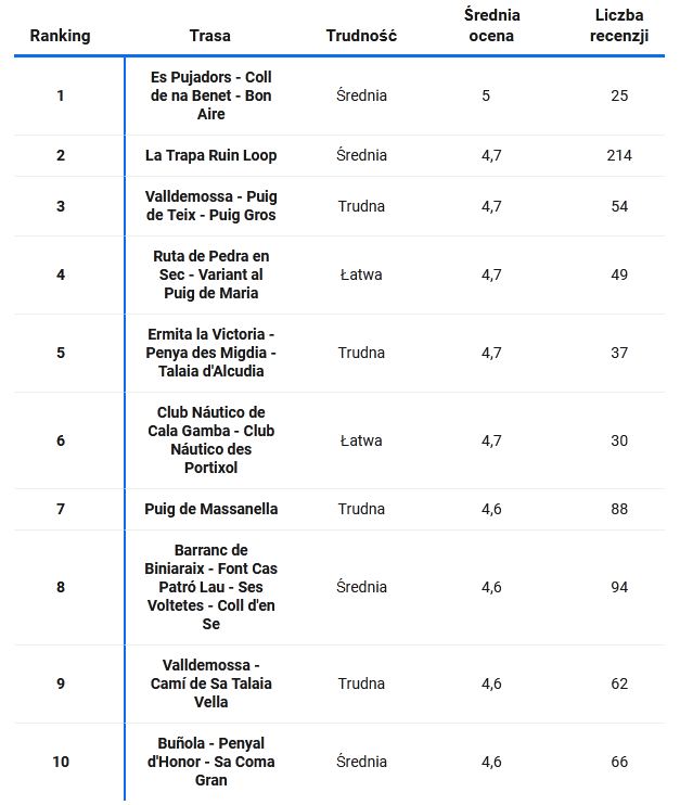 Ten ranking powstał na podstawie analizy danych z AllTrails, aplikacji fitness & travel, wykorzystywanej do rekreacji na świeżym powietrzu. Uwzględniono wszystkie szlaki turystyczne na Majorce, a ranking został utworzony poprzez sortowanie od szlaków o najwyższej średniej liczbie gwiazdek i najwyższej liczbie recenzji do najniższej. Dane zebrano we wrześniu 2022 roku.