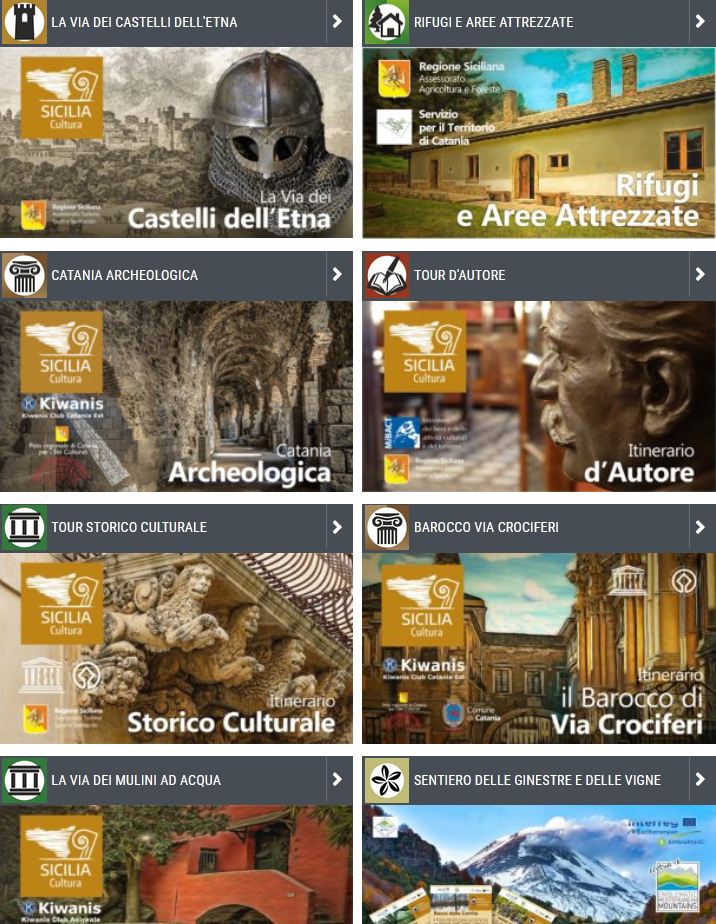 W przewodniku dostępne są także propozycje wycieczek czy propozycje tras tematycznych. Jedną z nich jest trasa autorska - wycieczka po miejscach we wschodniej Sycylii, gdzie urodzili się i urodzili tacy pisarze jak Giovanni Verga, Luigi Capuana, Ercole Patti, Federico De Roberto, Nino Martoglio, Silvana La Spina, Nino Piccione, Giuseppe Bonaviri, Antonino Russo Giusti. dorastał lub znalazł inspirację do swoich dzieł.