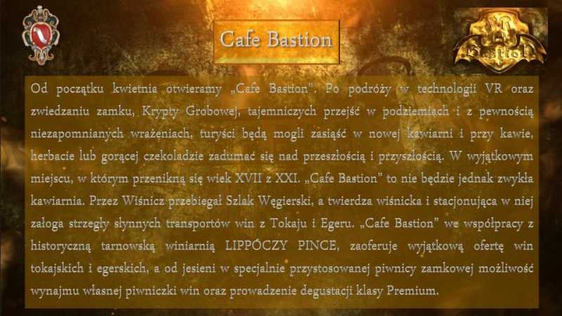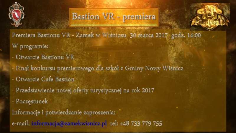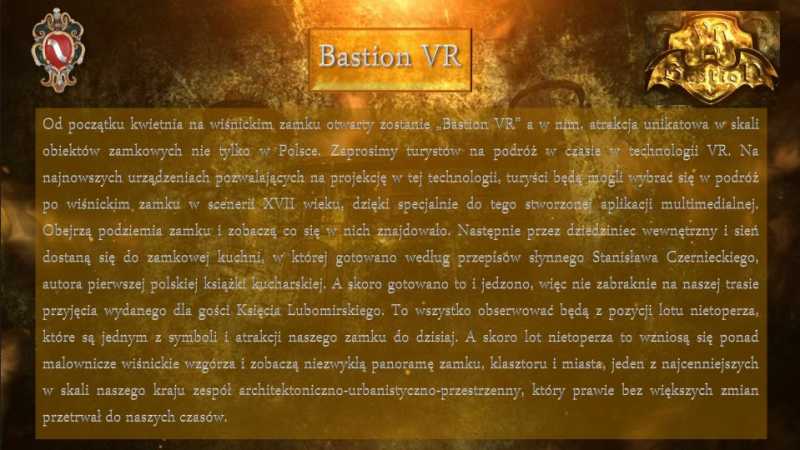 Nowe technologie wkraczają coraz dynamiczniej do prawie każdych sfer naszego życia, wkroczą więc też na Zamek w Wiśniczu. Od początku kwietnia otwieramy „Bastion VR” a w nim, atrakcję unikatową w skali obiektów zamkowych nie tylko w Polsce. Zapraszamy na podróż w czasie w technologii VR. Na najnowszych urządzeniach pozwalających na projekcję w tej technologii, turyści będą mogli wybrać się w podróż po wiśnickim zamku w scenerii XVII wieku, dzięki specjalnie do tego stworzonej aplikacji multimedialnej. Bastion VR czeka na Was!
