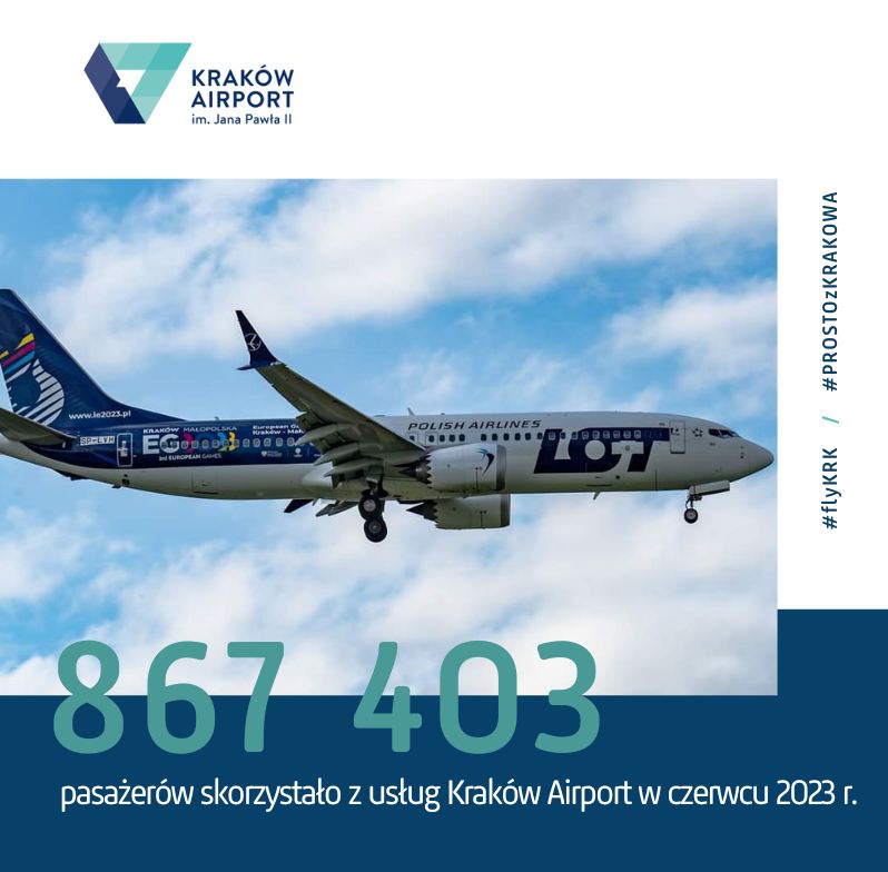 W czerwcu z usług krakowskiego lotniska skorzystało 867 403 pasażerów, czyli o 16 % więcej w stosunku do czerwca 2019 roku i o 21 % więcej w stosunku do czerwca 2022. Łącznie od początku roku w 2023 roku odnotowano 4 371 440 pasażerów.