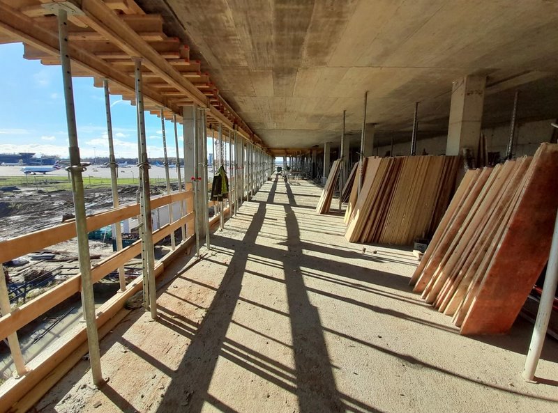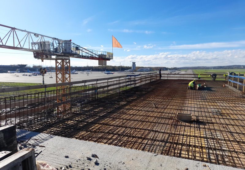 Dzisiaj zakończono prace związane z układaniem nawierzchni betonowej na całej rozbudowywanej płaszczyźnie. Całkowita powierzchnia nowej płaszczyzny wynosi prawie 11 ha. Aktualnie trwają prace związane z montażem opraw zagłębionych oświetlenia nawigacyjnego.