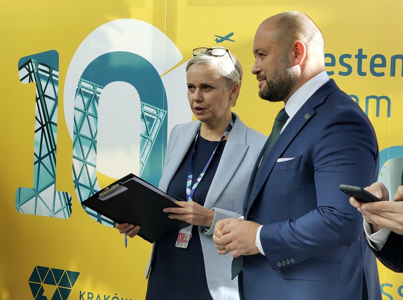Prezes zarządu Kraków Airport, Łukasz Strutyński oraz Natalia Vince Rzecznik Prasowy Kraków Airport