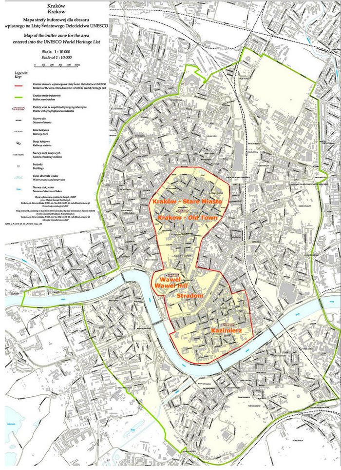 Poniżej widzisz mapę historycznego centrum Krakowa wpisanego na Listę UNESCO w 1978 roku – kontur terenu objętego ochroną jest zaznaczony pomarańczową linią, natomiast zieloną – obszar buforowy utworzony w 2010 roku. Trójczęściowy zespół obejmuje m.in. Stare Miasto, Wzgórze Wawelskie oraz dzielnicę Kazimierz (razem ze Stradomiem).