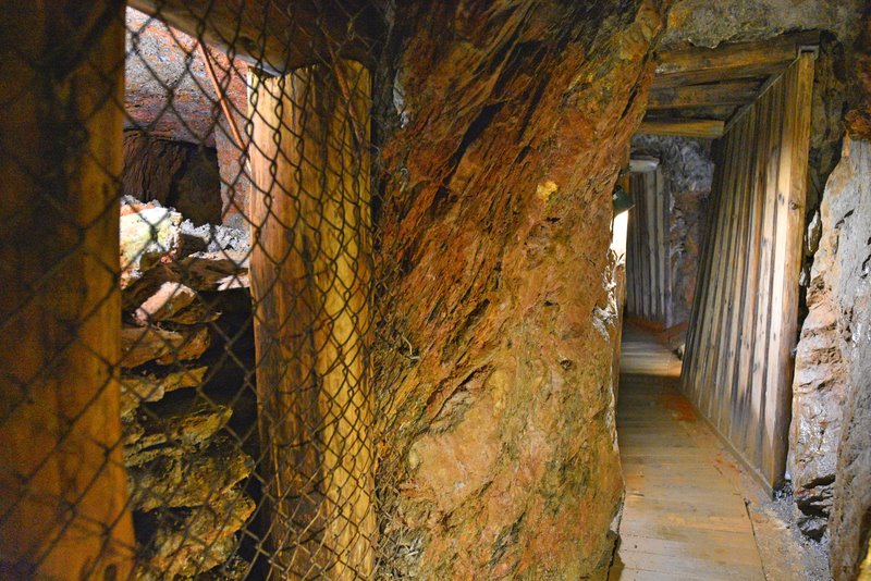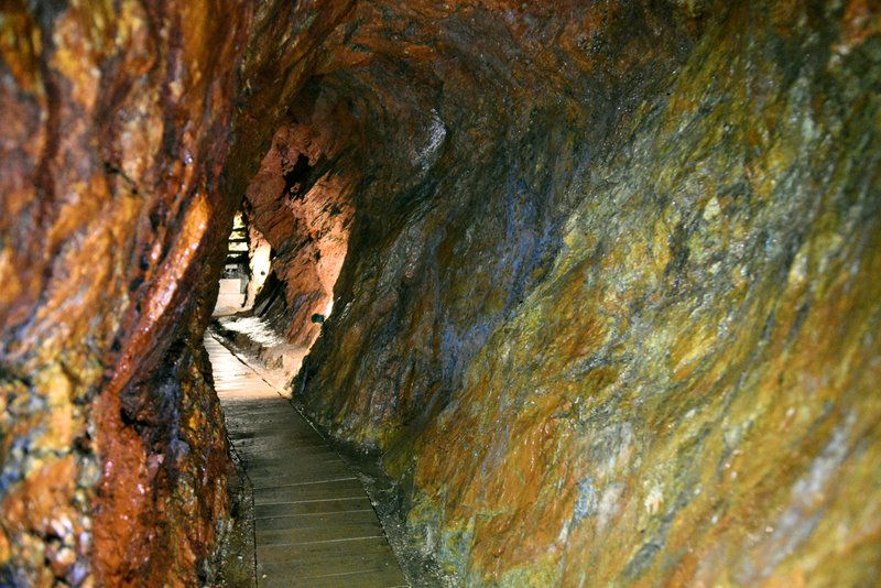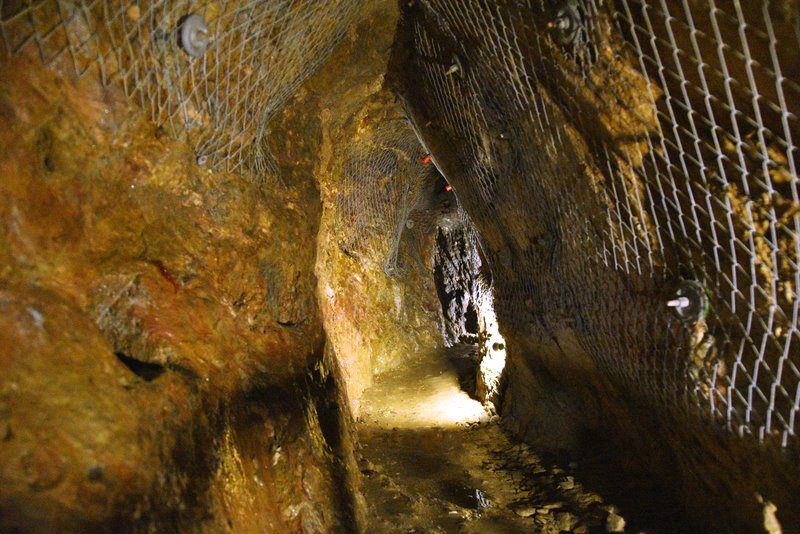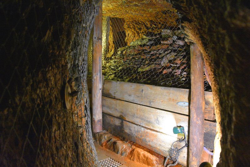 Zwiedzanie kopalni zaczynamy w kaskach, w dobudowanym tunelu z wystawą geologiczną.