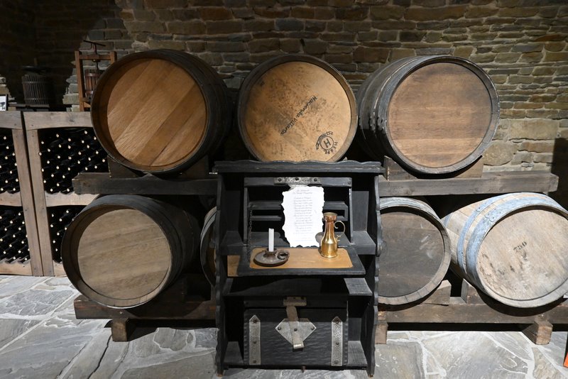Skład wina: Zrekonstruowane piwnice ukazują dawną funkcję jako magazynu wina, z rampą do wtaczania beczek i elementami wystroju przypominającymi historyczne warunki.