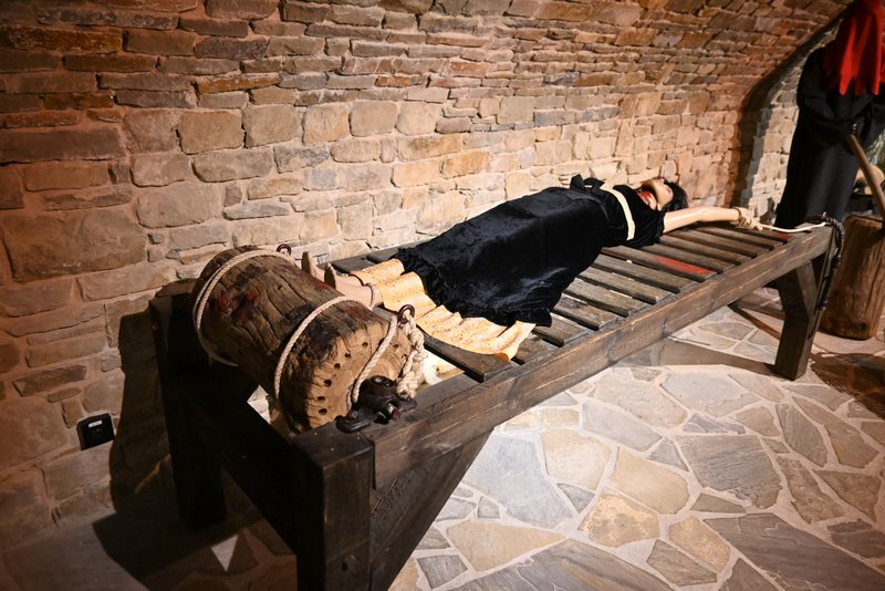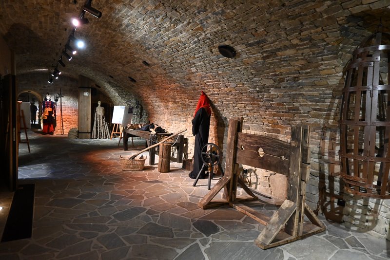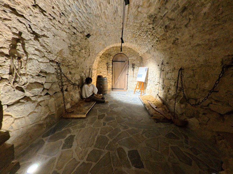 Więzienie i sala tortur: Jedna z komórek pełniła funkcję więzienia dolnego, z hakami, łańcuchami i metalowymi kunami na ścianach – artefakty potwierdzające dokumenty z 1678 r. Ogrzewane pomieszczenie powyżej mogło służyć jako więzienie górne podczas przesłuchań.