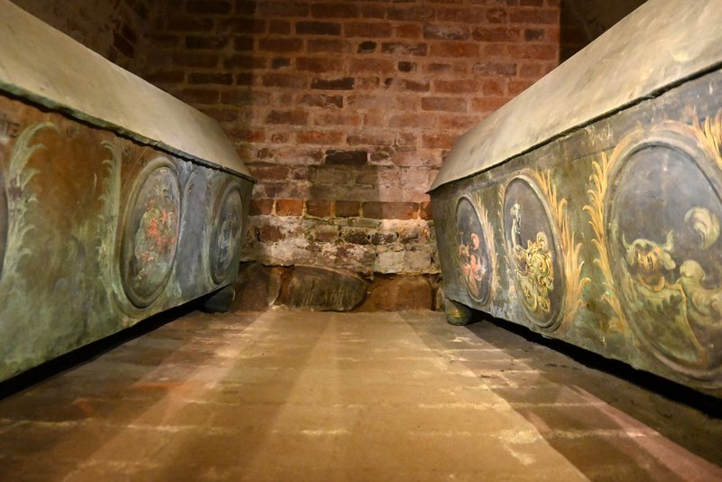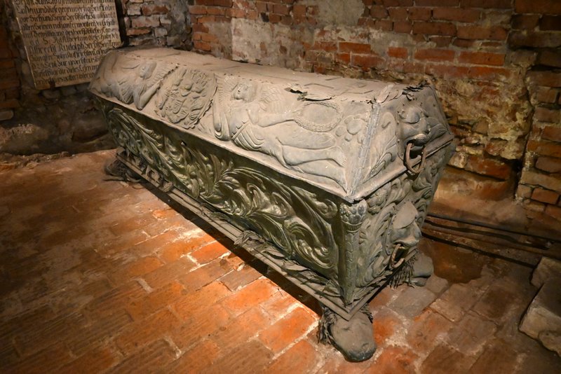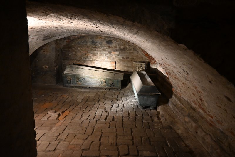 Naszym oczom ukazuje się przestrzeń krypt. Mrok rozprasza światło lamp, wydobywające z cienia sarkofagi. Ich zdobienia, wyryte dłutem kilkaset lat temu, zachowały się mimo wojen, pożarów i zawieruch dziejowych. Pomiędzy nimi – płyty nagrobne, niektóre wytarte niemal do nieczytelności. Najstarsza z nich pochodzi z 1461 roku. Każda to nie tylko kamień – to opowieść o człowieku, jego losach i roli w historii miasta.