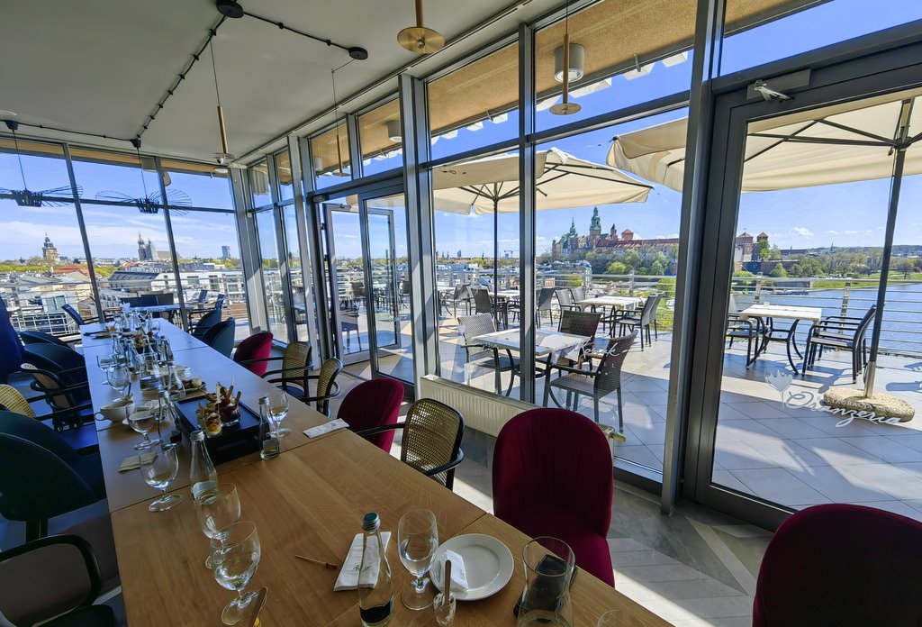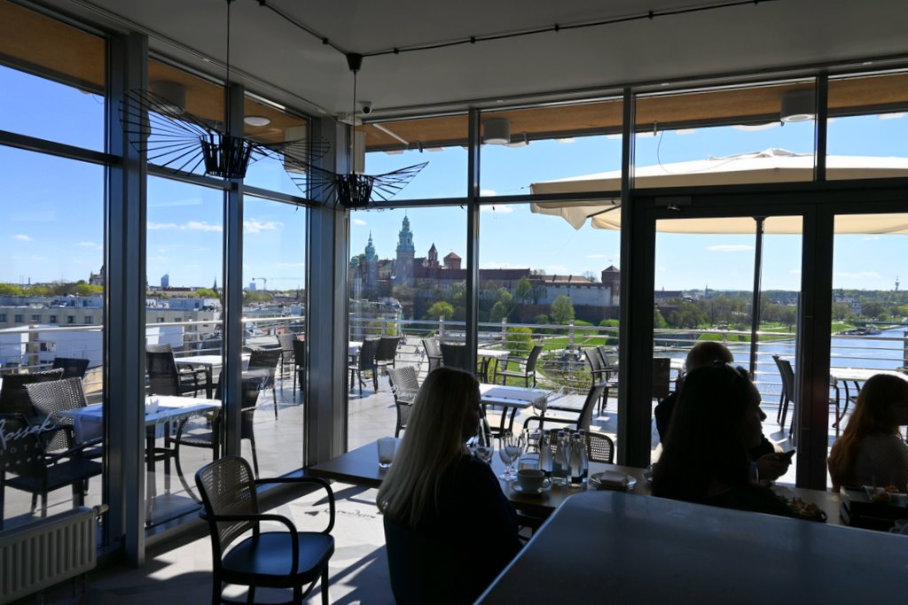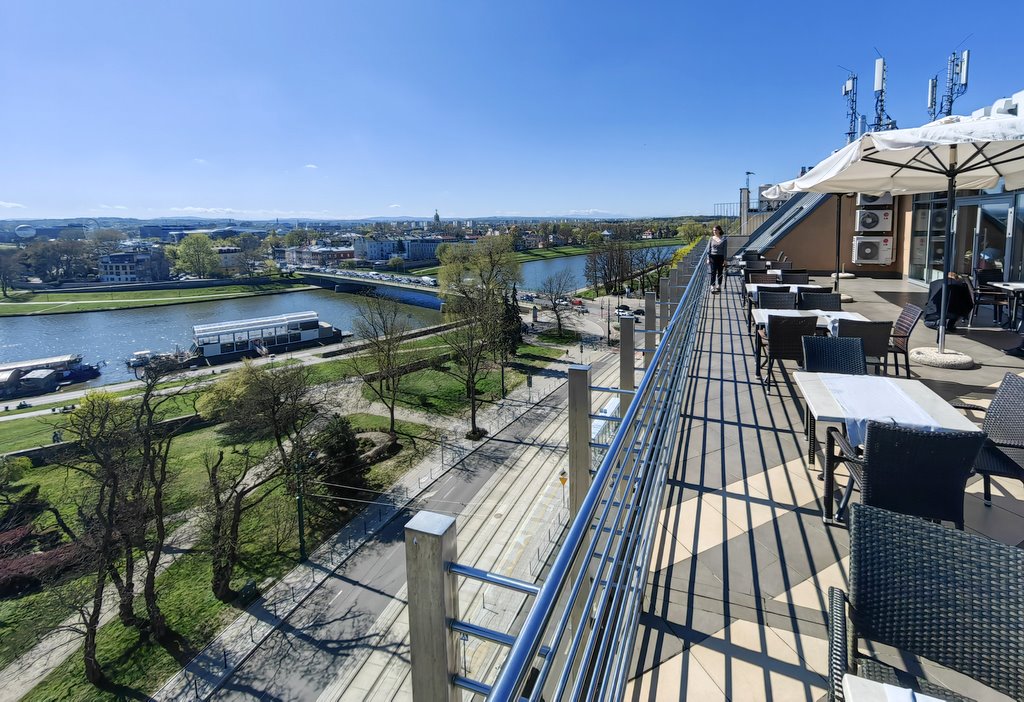 Nie musisz wspinać się na wieże kościołów – wystarczy wjechać na 6. piętro Hotelu Kossak i usiąść na tarasie Kawiarni Oranżeria. Przed Tobą: panorama Wawelu, zakole Wisły, dachy Starego Miasta, a przy dobrej pogodzie – Tatry i Babia Góra.