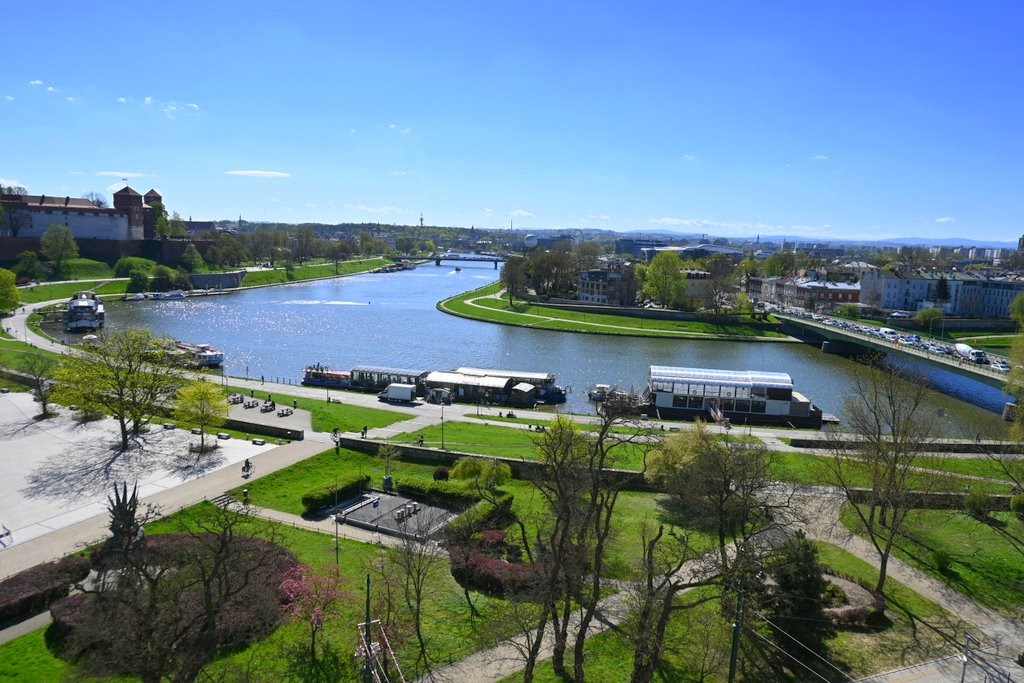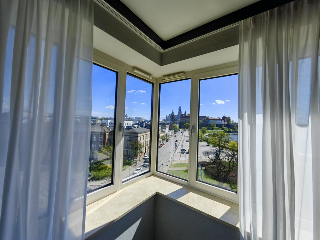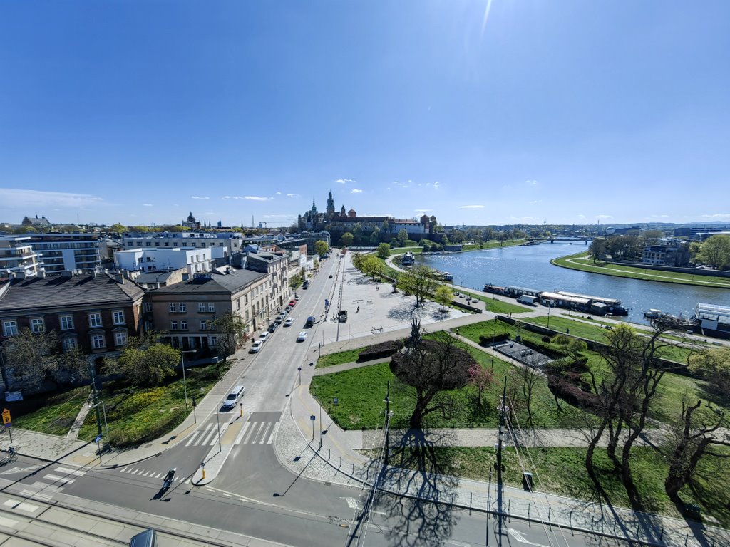 Z lewej strony nad dachami miasta wznoszą się gotyckie wieże Kościoła Mariackiego i sylwetka Ratusza. Na wprost – Wawel, dumnie górujący nad zakolem Wisły, zdaje się być na wyciągnięcie ręki. To miejsce, gdzie królewska przeszłość Krakowa dosłownie styka się z codziennością mieszkańców i turystów.