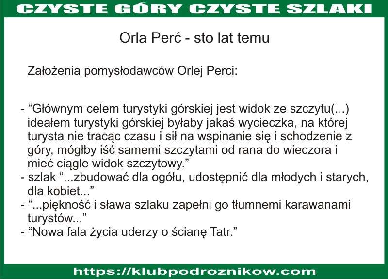 Wycieczka Orlą Percią jest niezmiernie interesująca i piękna, a przytem wysoce pouczająca, w ciągu nader krótkiego czasu bowiem poznajemy wszystkie szczyty i przełęcze, leżące w grani głównej między Zawratem a Krzyżnem i nabieramy dokładnego pojęcia o budowie całej tej grupy. Widoki roztaczające się z Orlej Perci są wspaniałe i bynajmniej nie jednostajne, lecz owszem zmieniające się wciąż, w miarę tego, jak posuwamy się naprzód.