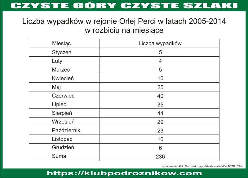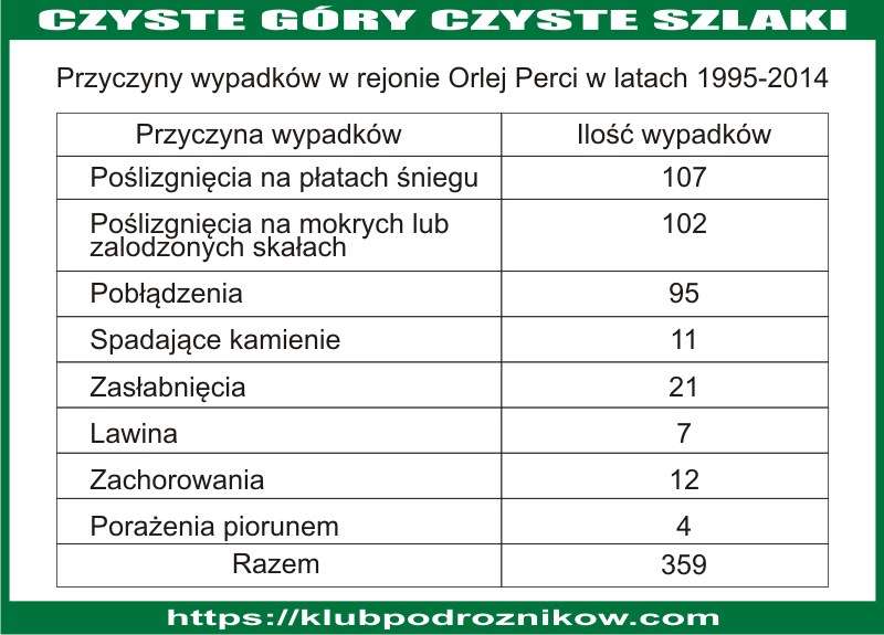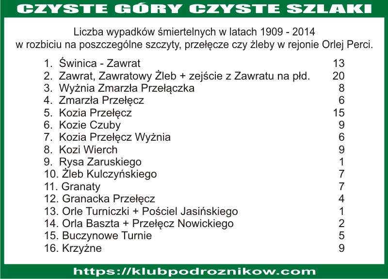 Tylko w ciągu ostatnich 25 lat i tylko w rejonie Orlej Perci zginęło 79 osób, natomiast w ciągu całego okresu prowadzenia kronik i statystyk, czyli od 1909 r Orla Perć pochłonęła 201 osób.