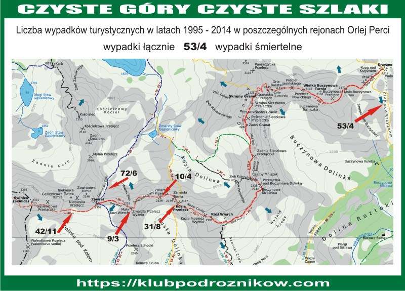 Miejsca gdzie dochodzi do wypadków najczęściej. Uwaga. Świnica - Zawrat jest szlakiem dojściowym a nie częścią Orlej Perci.
